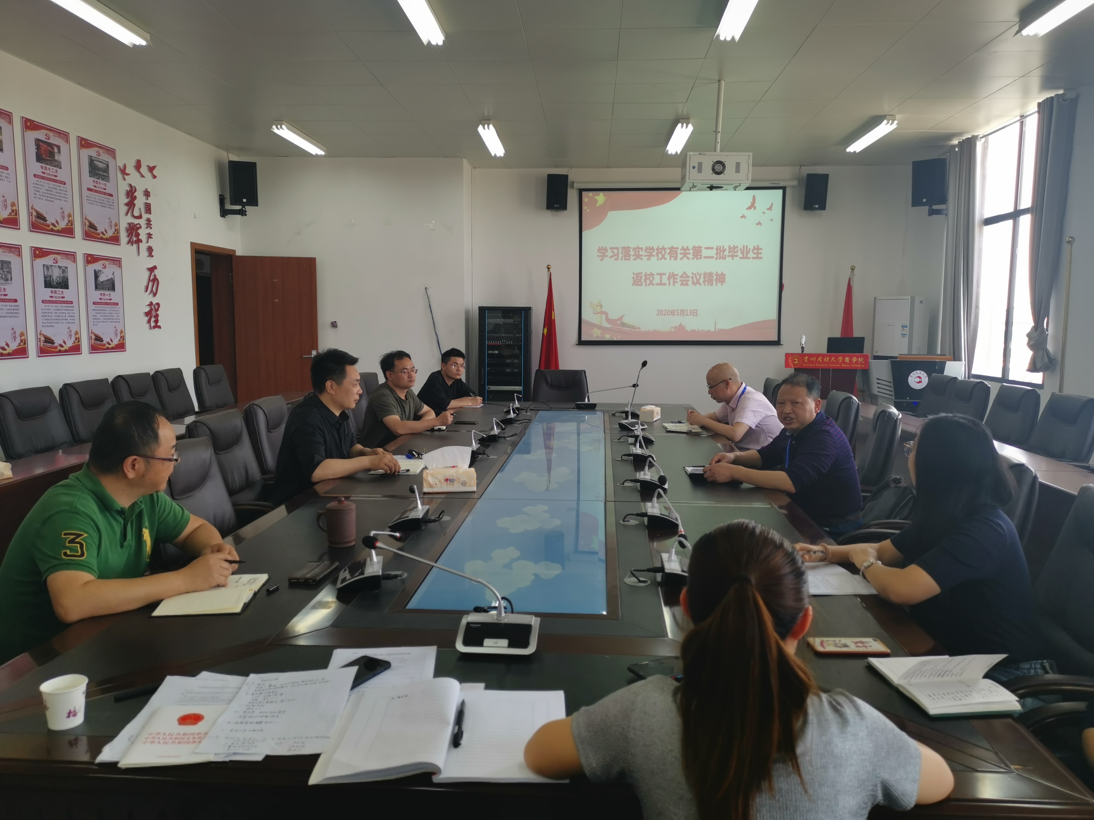 2020年5月13日下午,商学院党委召开第二批2020届毕业生返校复学工作部署会,会议由学院党委书记晏超同志主持,学院班子成员、疫情防控领导小组成员和毕业班班主任参加了会议。